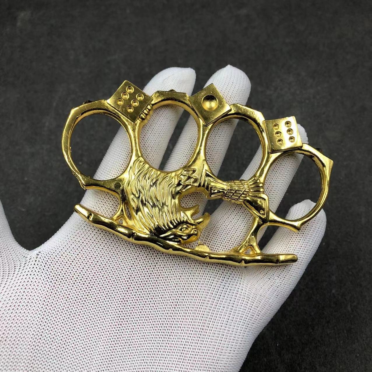 Specifications: Width (bottom of the hand): 90mm (finger width): 97mmHeight (fist arc to bottom): 62mm (finger hole size): 26*20mm Thickness (fist): 11mmWeight: about 113 grams Material: zinc alloy Craftsmanship: gold and silver are electroplated; black is sprayedGants de boxe à quatre doigts, poing américain, outils d’autodéfense FR